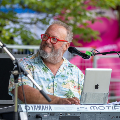The product of an opera soloist/choral director mother and a wicked piano player father, Brian's influences span Mozart to Motown, ska to Santana. Active on the Vancouver Scene since 1980, Brian has played keys and more with, The Invaders, Mae Moore, Christine Best and “The Dynamics” to name a but a few bands. Known as a very energetic performer, nothing makes him happier than a packed danced floor that sings along with the band.